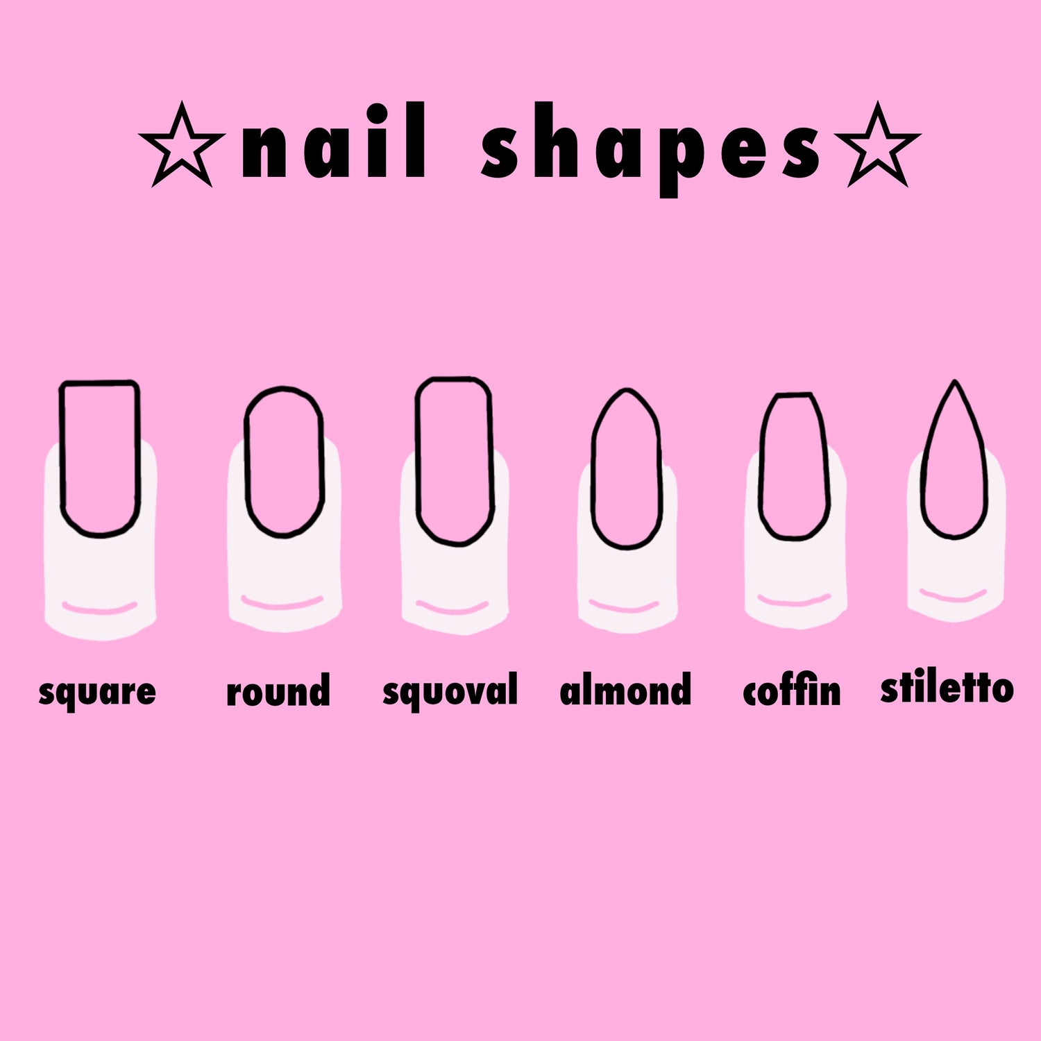 here at RhiSetz we offer square, round, squoval, almond, coffin and stiletto as shape options.
