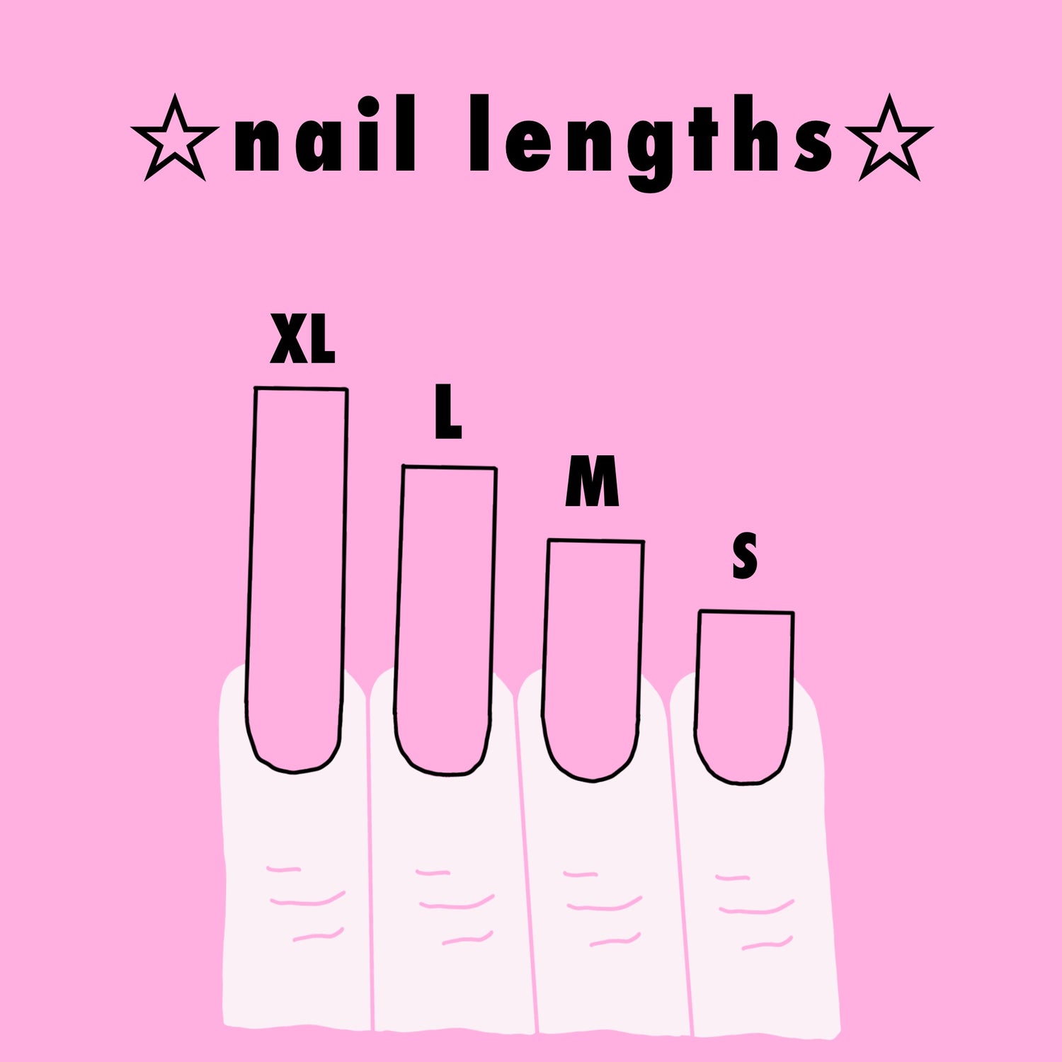 here is a rough guide of what you can expect - nail length may differ due to everyone having unique nail beds (a length that may be long on myself may appear shorter on yourself).